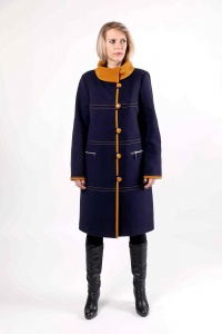 Демисезонное пальто прямого силуэта. Рукав втачной двухшовный. Спинка со средним швом. На переде прорезной карман на молнии. По швам переда и рукава проложена отделочная строчка в тон материала отделки. Воротник высокая отложная стойка. Застёжка от верха на навесные петли.