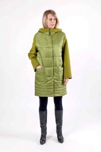 Женское укороченное демисезонное пальто прямого силуэта с расширенной линией плеч. Бейка капюшона и рукава выполнены из кашемира, а спинка и полочки - из стеганной с синтепоном плащевой ткани. Накладные карманы застегиваются на кнопки. Пальто застегивается до края капюшона на застежку «молния», а планка правой полочки- на кнопки.