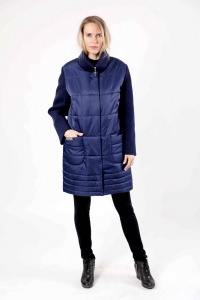 Женское укороченное демисезонное пальто прямого силуэта с расширенной линией плеч. Воротник-стойка и рукава выполнены из трикотажа, а спинка и полочки - из стеганной с синтепоном плащевой ткани. Накладные карманы застегиваются на кнопки. Пальто застегивается до края воротника на застежку «молния», а планка правой полочки- на кнопки.